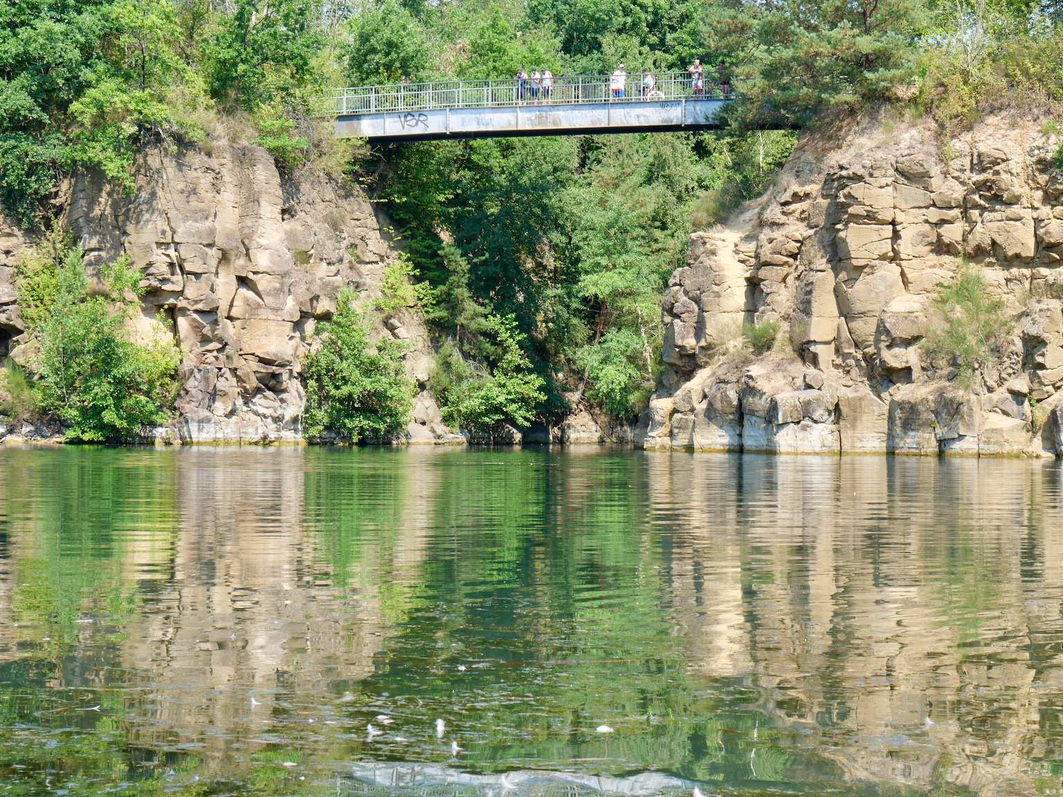 Nach dem Ende des Basaltabbaus in den 1980er-Jahren entstand zwischen Steinheim und Dietesheim eine Seenlandschaft mit mehr als 60 Hektar Gesamtfläche, davon rund 20 Hektar Wasserfläche. Absolutes Highlight ist die schmale Brücke in schwindelerregender Höhe zwischen den größten Seen, dem Vogelsberger See und dem Oberwaldsee. Und noch eine Bitte: Um die Pflanzen- und Tierwelt zu schützen, bleibt bitte auf den Wegen im Naturschutzgebiet Oberwaldsee.